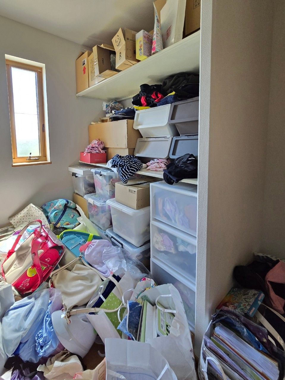 おもちゃ部屋、小上がり、クローゼット・・床にモノがあふれて、片付けようと思っても、どこから手を付ければいいかわからない状況だったと思います。